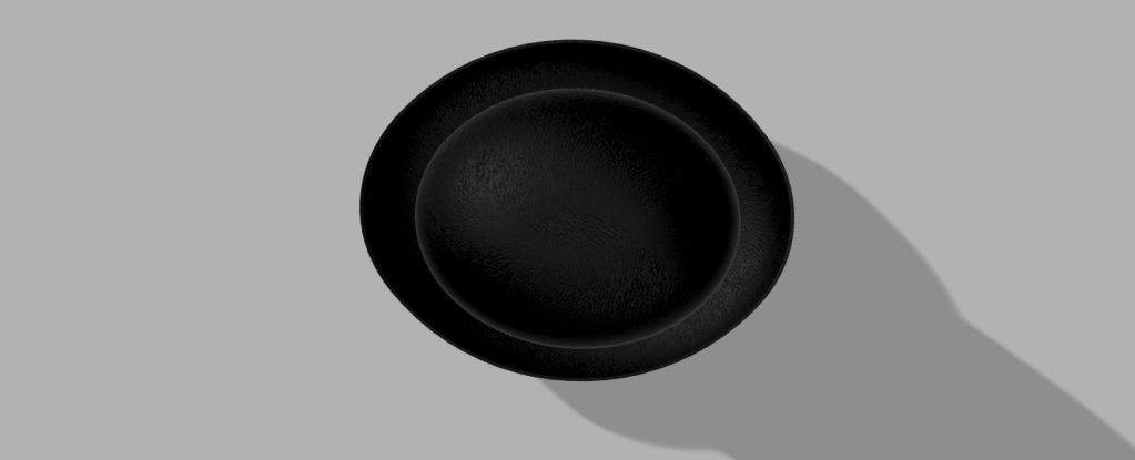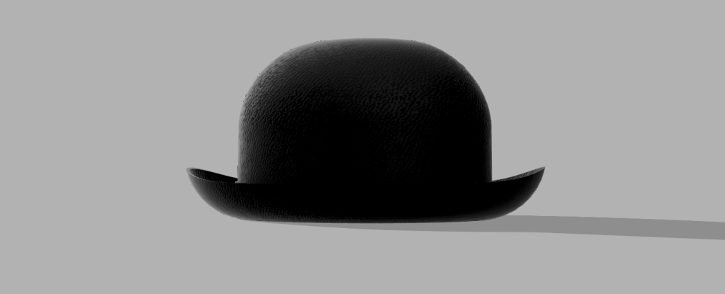 When designing the bowler hat, I first found an image on google that I could roughly base my hat’s unique shape to. The only important part to choosing the photo is that it could not be taken at any angle. I then lined up 2 ellipses to the image and extruded them to create a box hat type shape. Next, I filleted the sides to create the curved portions and shelled both in order to create the rough shape. However, the rim was not cut properly. In order to cut the rim, I used a fit point spline. I drew the shape of the rim and then extruded the shape through each side of the hat. This left a hole through the whole hat. To finish off the shape, I extruded the shape above the hole down to fit and connect with the rim. I then changed the texture and color to black leather in order to match the example from class.
